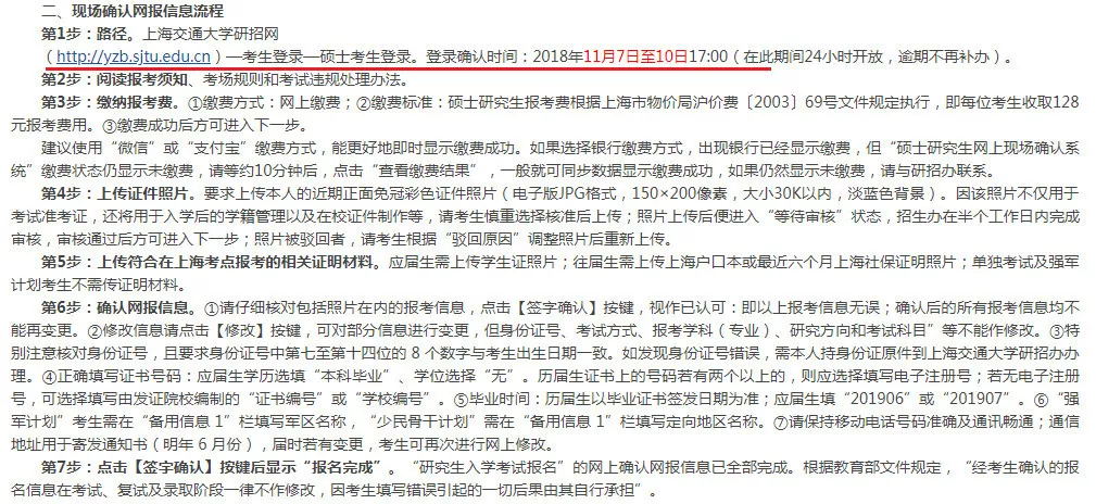 考生均須在上海交通大學(xué)研招網(wǎng)上對本人報名信息進行報名確認。上海交通大學(xué)考點的網(wǎng)上確認時間為:2018年11月7日至10日17:00,考生按網(wǎng)上確認要求和步驟進行網(wǎng)報確認。