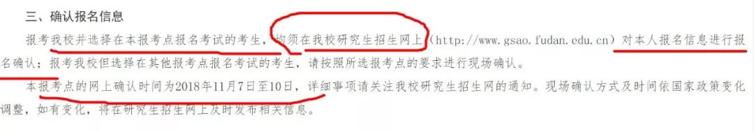 選擇復(fù)旦大學(xué)為報考點的考生請于2018年11月7日至10日,登錄復(fù)旦大學(xué)研究生招生網(wǎng)上(http://www.gsao.fudan.edu.cn)對本人報名信息進行報名確認;報考復(fù)旦但選擇在其他報考點報名考試的考生,請按照所選報考點的要求進行現(xiàn)場確認。