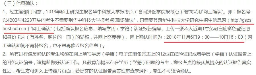 2018年碩士研究生報名華中科技大學(xué)報考點(含同濟醫(yī)學(xué)院報考點)報名號為4202與4223開頭的考生繼續(xù)采用“網(wǎng)上確認”,網(wǎng)上確認時間為11月6日9:00至10日16:00。