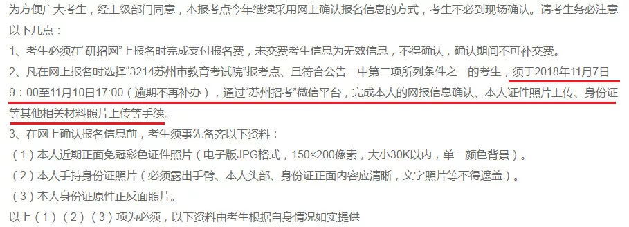 凡在網(wǎng)上報名時選擇“3214蘇州市教育考試院”報考點、且符合確認條件的考生,須于2018年11月7日9:00至11月10日17:00(逾期不再補辦),通過“蘇州招考”微信平臺,完成研究生報名網(wǎng)上確認手續(xù)。