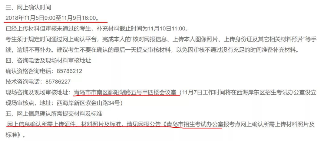 網(wǎng)上確認時間:2018年11月5日9:00至11月9日16:00。 已經(jīng)上傳材料但審核未通過的考生,補充材料截止時間為11月10日11:00。 考生須于規(guī)定時間通過網(wǎng)上確認平臺,完成本人的“核對網(wǎng)報信息、上傳本人圖像照片、上傳身份證及其它相關(guān)材料照片”等手續(xù),逾期不再補辦。建議考生不要在確認的最后一天提交審核材料,以免因?qū)徍瞬煌ㄟ^沒有充足的時間準(zhǔn)備補充材料。