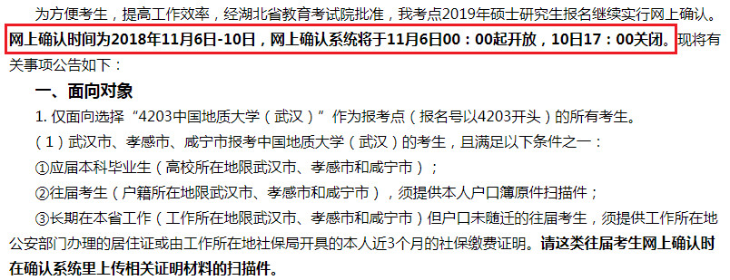 為方便考生,提高工作效率,經(jīng)湖北省教育考試院批準(zhǔn),我考點2019年碩士研究生報名繼續(xù)實行網(wǎng)上確認(報名號以4203開頭的考生)。網(wǎng)上確認時間為2018年11月6日-10日,確認系統(tǒng)將于11月6日0:00起開放,10日17:00關(guān)閉。