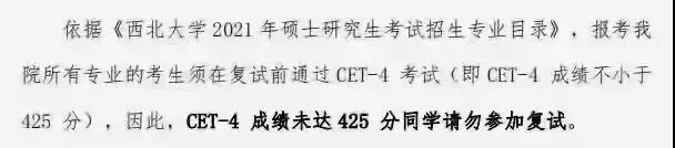 21考研西北大學生命科學學院研究生招生簡章要求考生在復試前通過四級考試,成績低于425分的同學沒辦法參加復試!今年最新的招生簡章還未公布,有想報考這個院校的同學今年要重點關注哦~