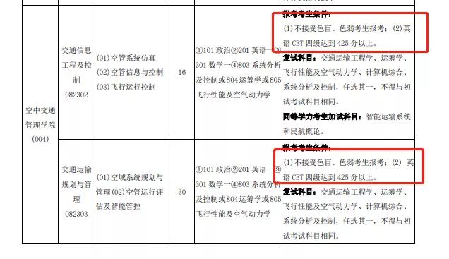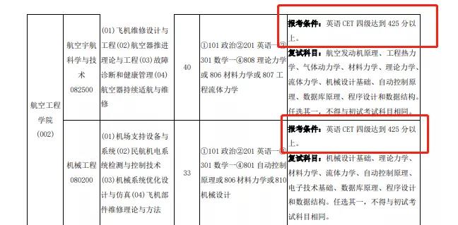 中國民航大學研究生招生簡章空中交通管理學院、航空工程學院、計算機科學與技術學院等專業的報考條件為英語四級達到425分以上。