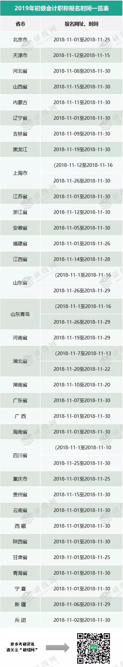 以下是各個地區2019年初級會計職稱報名時間匯總表: