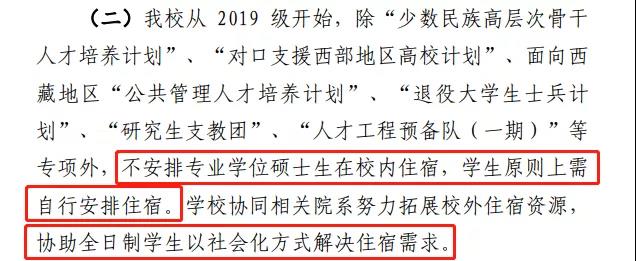 復(fù)旦大學(xué)從2019級(jí)開始,除“少數(shù)民族高層次骨干人才培養(yǎng)計(jì)劃”、“對(duì)口支援西部地區(qū)高校計(jì)劃”、面向西藏地區(qū)“公共管理人才培養(yǎng)計(jì)劃”、“退役大學(xué)生士兵計(jì)劃”、“研究生支教團(tuán)”、“人才工程預(yù)備隊(duì)(一期)”等專項(xiàng)外,不安排專業(yè)學(xué)位碩士生在校內(nèi)住宿,學(xué)生原則上需自行安排住宿。