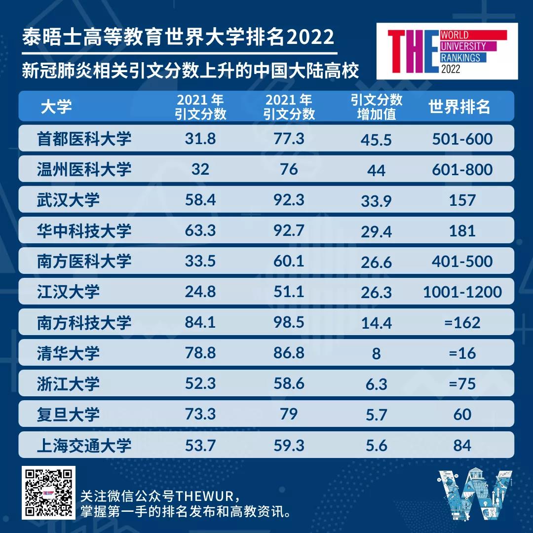 新冠肺炎疫情在這一年持續蔓延,本年度排名反映了高校在了解和應對新冠肺炎危機方面的重要作用,因為很多高校在新冠肺炎重點研究方面的引文分數大幅提升。