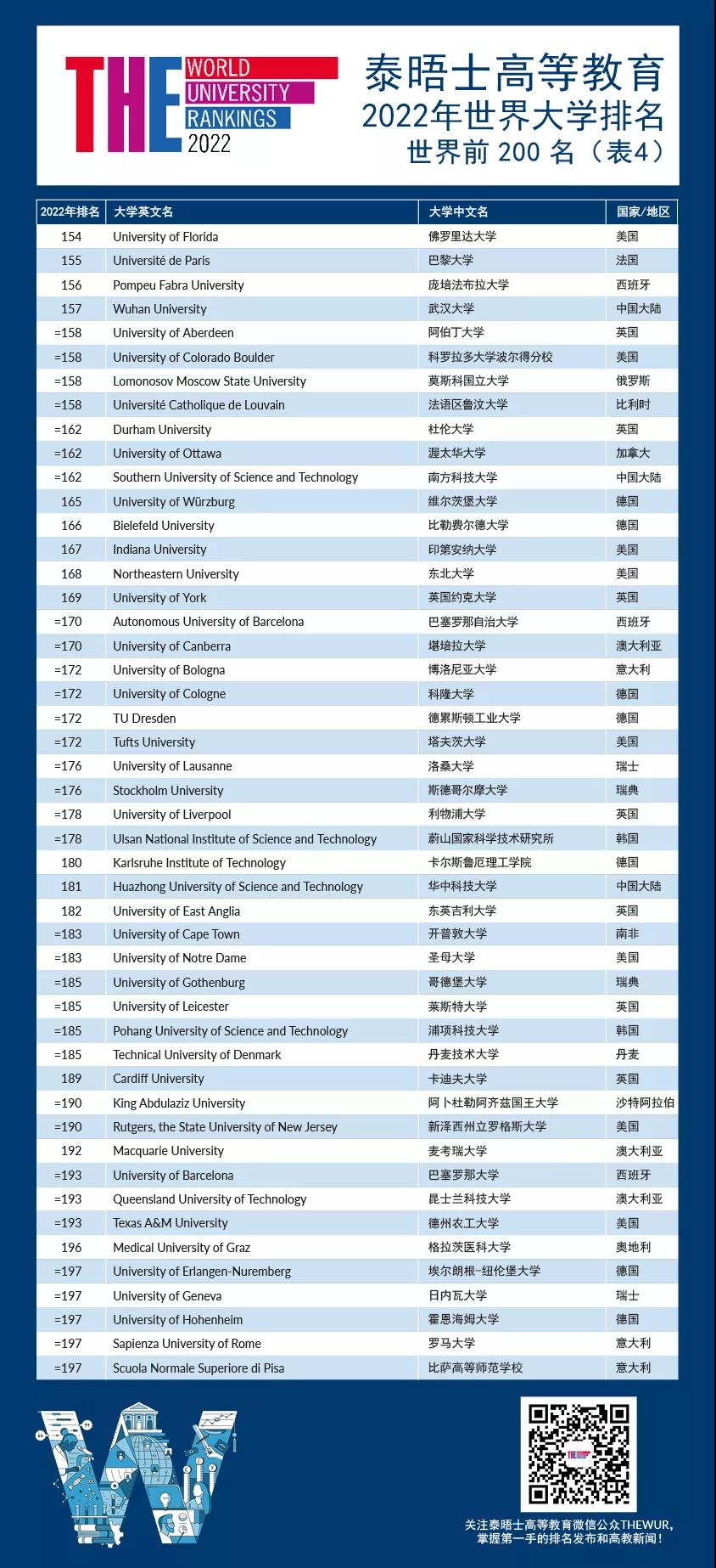 中國大陸還刷新了一項紀錄,共有 10 所高校躋身前 200名,包括武漢大學(第 157 名)、南方科技大學(第 162 名)和華中科技大學(第 181 名)在前 200 名的 10 所高校中,有 9 所排名上升。