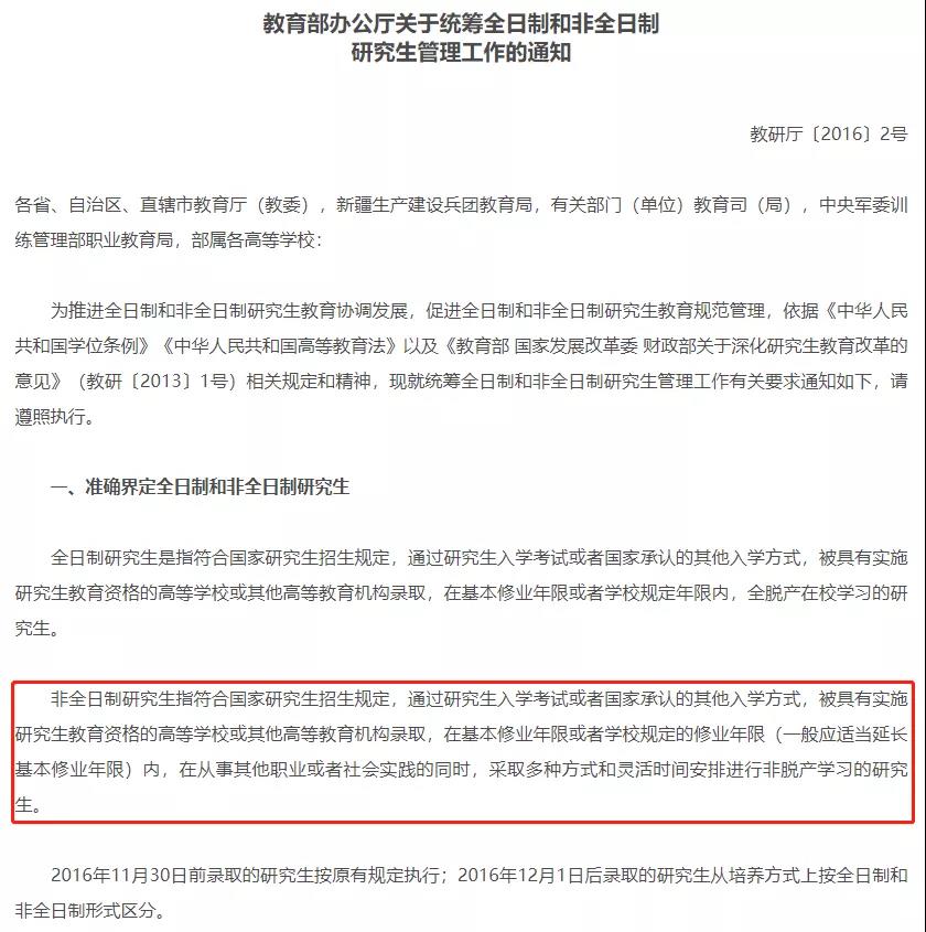 非全日制的教育起步晚于全日制,是由以前的“在職研究生”演變而來。2016年9月,教育部發(fā)布《關(guān)于統(tǒng)籌全日制和非全日制研究生管理工作的通知》,首次準確界定了全日制研究生和非全日制研究生,主要在學習時間安排、全脫產(chǎn)和非脫產(chǎn)上有所不同。2016年12月1日后錄取的研究生從培養(yǎng)方式上按全日制和非全日制形式區(qū)分,從此“非全”正式走上了研究生教育的舞臺。