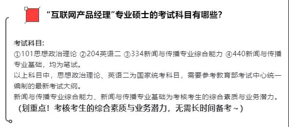 2020年,某知名高校發(fā)布了《2021“互聯(lián)網(wǎng)產(chǎn)品經(jīng)理”非全日制專業(yè)碩士報名》的公告,在相關(guān)“考試科目”介紹中可以發(fā)現(xiàn)除了規(guī)定的國家統(tǒng)考科目外,其余兩門有專業(yè)代號、新聞傳播類專碩考研必考的科目并不在重點考察范圍內(nèi),官方也標注了“無需長時間備考”。