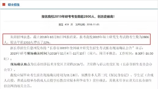 從研招網(wǎng)獲悉,截止2018年10月31日網(wǎng)報結(jié)束,報考我校2019年碩士研究生考試的考生數(shù)為2806人,較去年的2310人增長了22%。(摘自長春中醫(yī)藥大學研究生院)