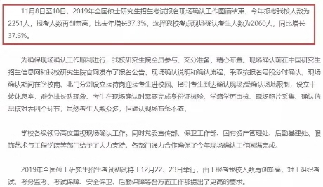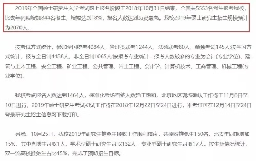 2019年全國碩士研究生入學考試網(wǎng)上報名階段于2018年10月31日結(jié)束,全國共5553名考生報考我校,比去年同期增加844名考生,增幅達到18%,報名人數(shù)達到歷史最高。我校2019年碩士研究生招生規(guī)模預計為2070人。