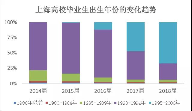 統計數據顯示,2018屆上海高校畢業生中,95后即1995年以后出生的約占67.3%,與上屆高校畢業生相比增加19.9個百分點;遠遠高于其他各年齡段的畢業生所占比重,成為上海應屆畢業生的主力軍.