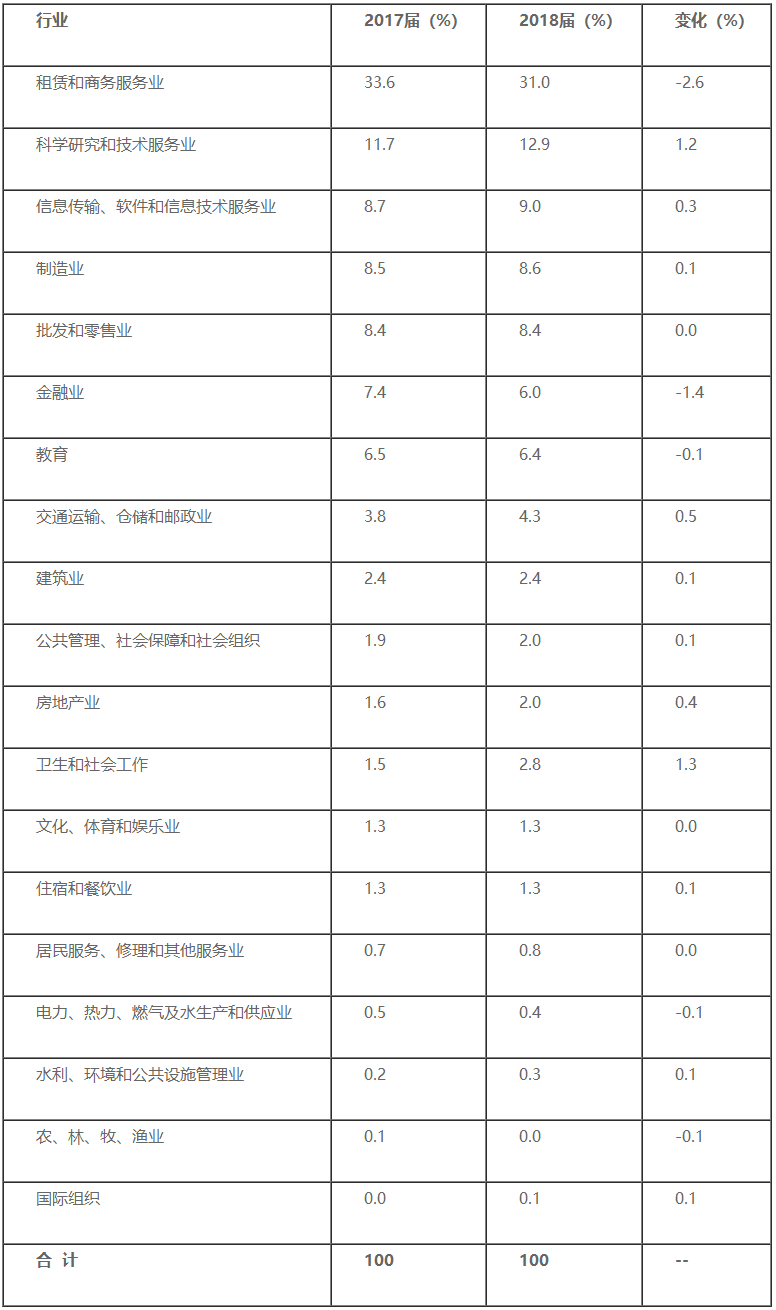 從行業分布情況來看,租賃和商務服務業吸納的2018屆上海高校畢業生最多,約占31.0%;其次是科學研究和技術服務業,吸納的高校畢業生約占12.9%;信息傳輸、軟件和信息技術服務業,即通常所說的IT行業,吸納的高校畢業生約占9.0%.從增長幅度來看,科研行業是增幅最大的行業,且近年來持續保持增長趨勢.
