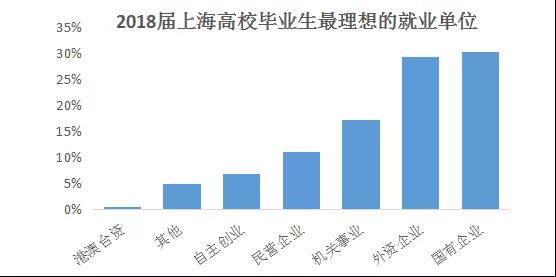 調查數據顯示,30.4%的2018屆上海高校畢業生,心目中最理想的就業單位是國有企業,所占比重最高;其次是外資企業,所占比重為29.4%.