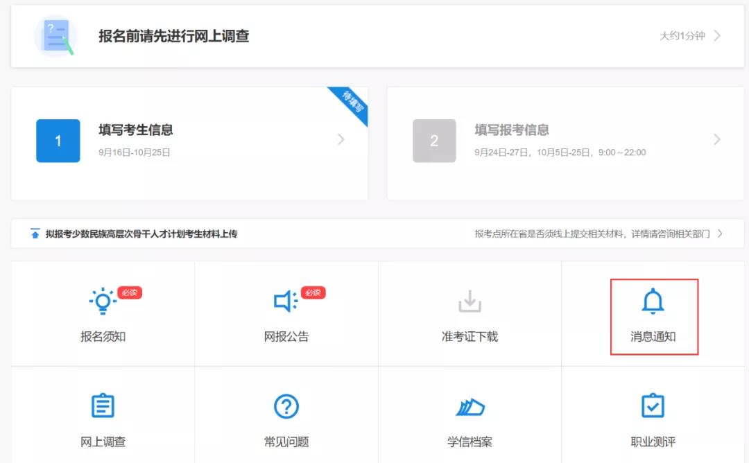 消息通知主要是報考點或招生單位發(fā)送的招考網報信息,考生登錄網報平臺,查看消息通知即可!如果沒有收到消息,說明報考點或招生單位沒有新的網報消息通知,考生不必驚慌。