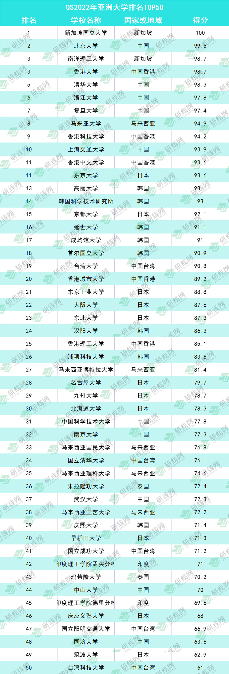TOP50高校中,中國高校占據20所,日本11所,韓國8所,馬來西亞5所。2022QS亞洲大學排名TOP50高校詳細名單如下: