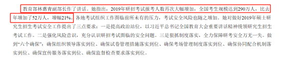 會議上,教育部林蕙青副部長作了講話。她指出,2019年研招考試報(bào)考人數(shù)再次大幅增加,全國考生規(guī)模達(dá)到290萬人,比去年增加了52萬人,增幅21%。各地考試組織工作面臨前所未有的壓力,考試安全風(fēng)險(xiǎn)也隨之增加。
