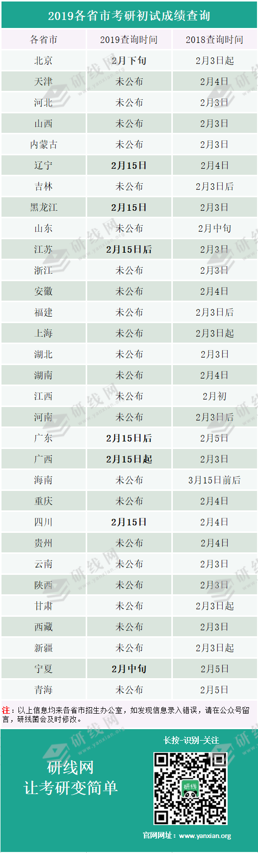 1. 2月中旬初試成績公布。全國不同的省份公布查詢分數的時間不同,每個省的不同學校也會有所不同,但是時間差距都不大。