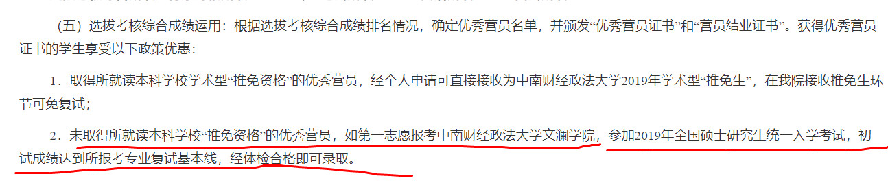 如:中南財經大學文瀾學院:如果獲得優秀營員但未獲得本校推免資格,參加全國統考的考生,只要過復試分數線,體檢合格可直接錄取,也就是免復試。