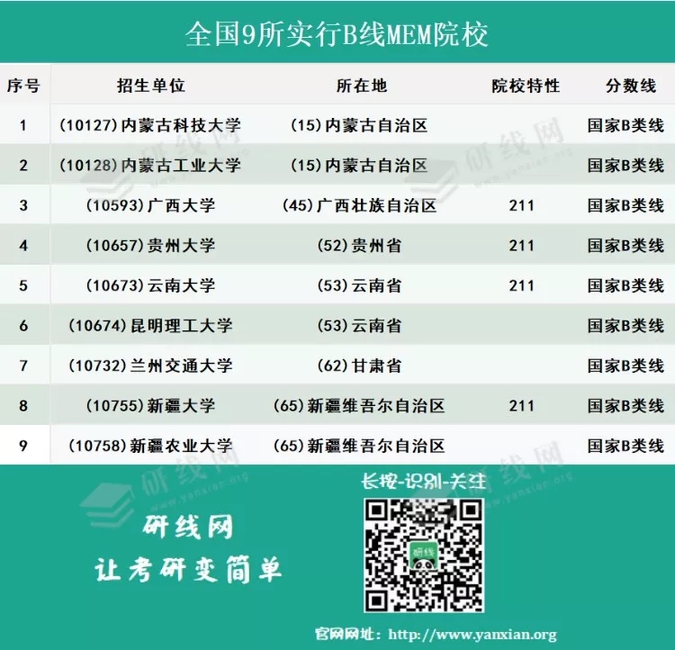 國家B線是指B類地區(qū)分?jǐn)?shù)線,即西部線,B類院校每年復(fù)試分?jǐn)?shù)線參照國家B線標(biāo)準(zhǔn),執(zhí)行西部線的地區(qū)有:內(nèi)蒙古、廣西、海南、貴州、云南、西藏、甘肅、青海、寧夏、新疆等10個省(區(qū))。