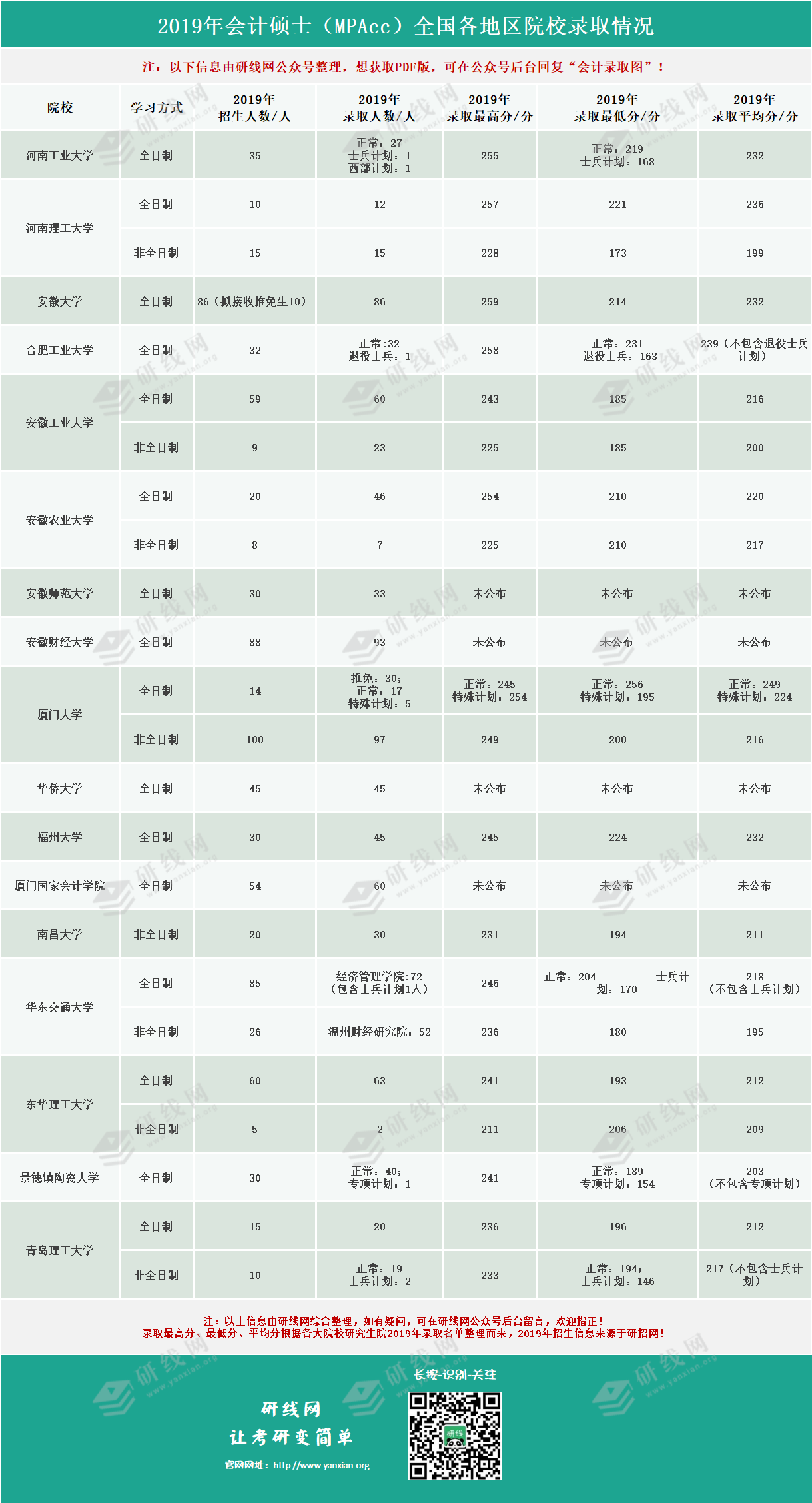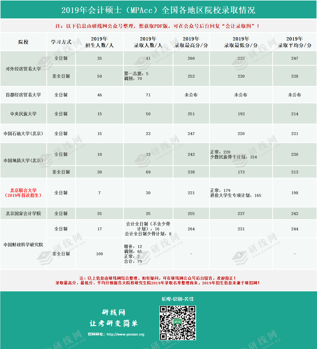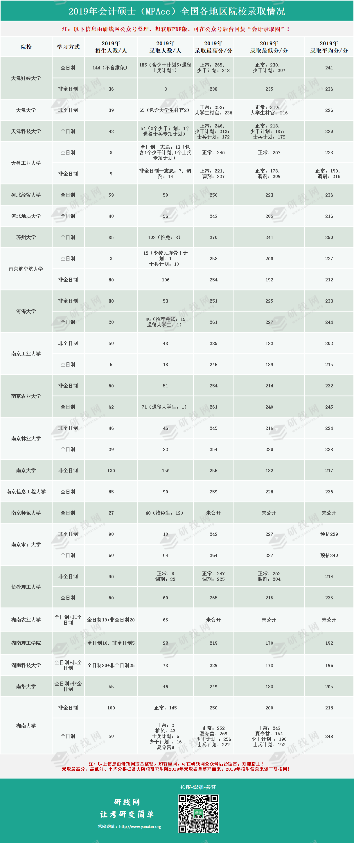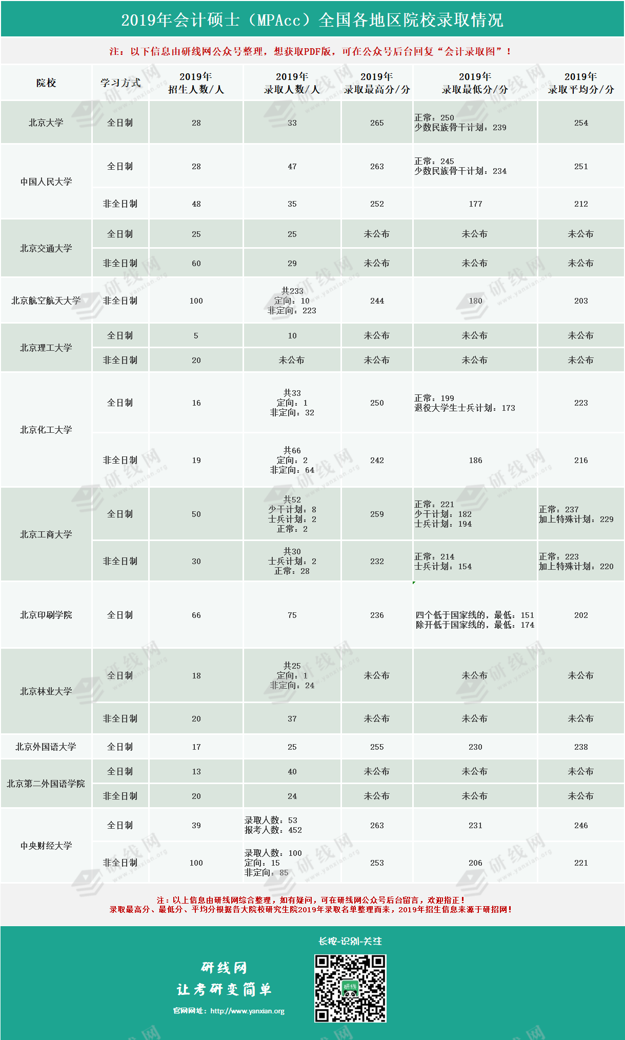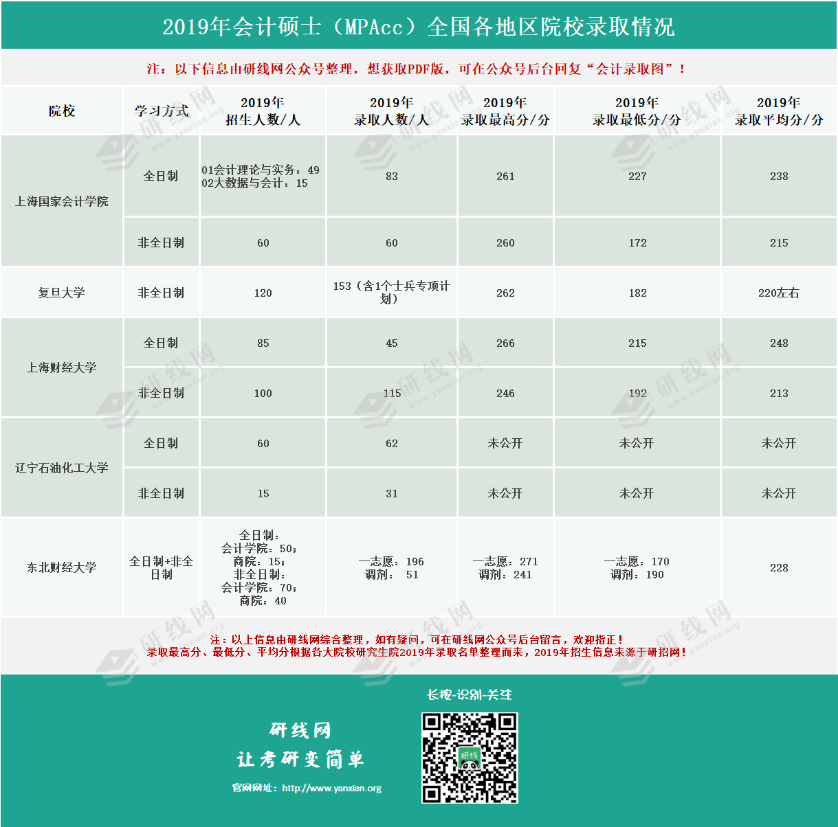 至今,研線網小編收集了100多所院校會計專碩的錄取名單。通過錄取名單計算平均分、實際錄取人數,并篩選出最高分、最低分。