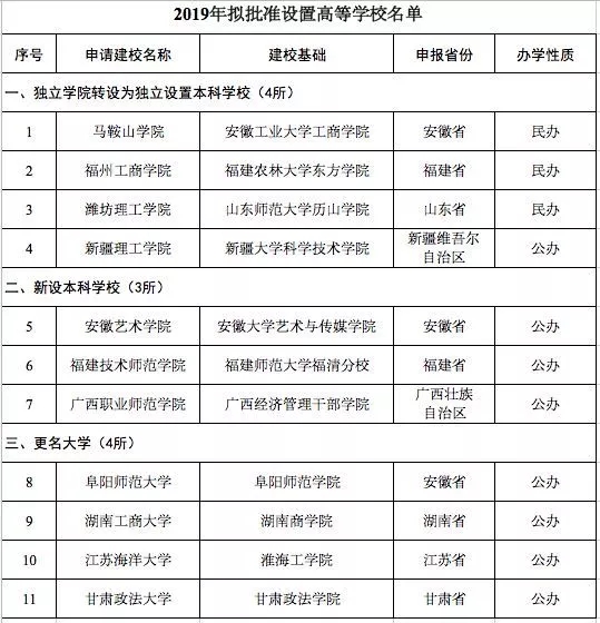 2019年5月24日,教育部官方網站公布了《關于2019年擬批準設置高等學校的公示》。