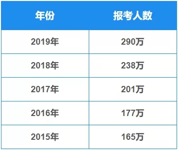 2018年12月23日,又一年的考研大戰開始,這一年的考研人數,再一次變成了“歷史新高”。從教育部公布的數據來看,2019年全國考研報名人數達到了史無前例的290萬人,比2018年考研人數增加了52萬人,增幅達到了21.8%,考研增加人數和增長率均為近年來最高。從上圖中可以看出,近5年,考研人數逐年增長,同2015年的165萬人相比增加了125萬人,研究生報考人數的快速上漲也引發了社會的廣泛關注。