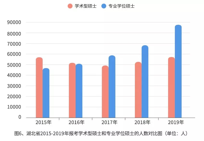 從上面兩張圖片中我們可以看到,2015年兩省專業學位碩士報考人數與學術型碩士相比略少一些,2016年基本持平,從2017年到2019年,專業學位碩士的報考人數已經超過了學術型碩士。