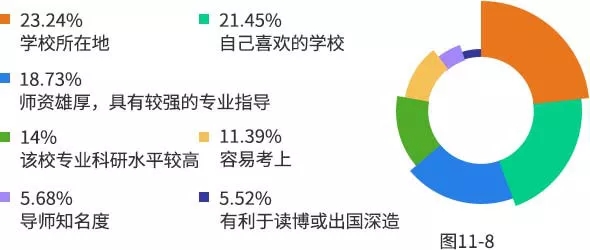 分析:從調查結果可知,學校所在地和本人對報考院校的心儀程度是大部分考生選擇報考選校的重要因素。同時,師資情況和學校考研水平的高低等軟件條件也是考生們非常關注的因素。
