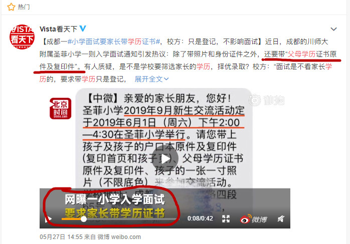 近日,有一條新聞引發網友熱議。成都某小學入學面試,要求家長除了帶照片和身份證件之外,還要帶“父母學歷證書原件及復印件”。