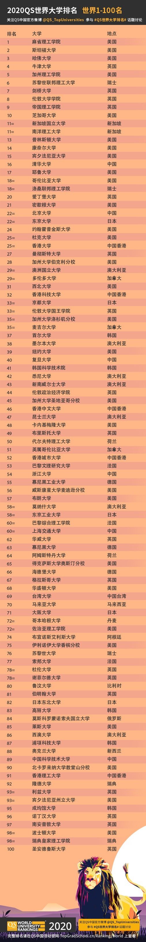 全球高等教育權(quán)威研究機構(gòu)QS Quacquarelli Symonds 發(fā)布2020 QS世界大學排名!