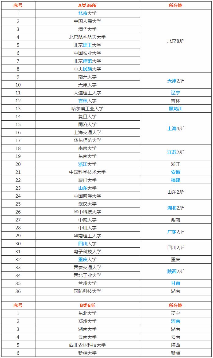 從名單中可以看出,世界一流大學A類高校36所,且這36所高校以前全是985高校;B類高校6所,其中東北大學、湖南大學、西北農林科技大學以前為985大學,另外的鄭州大學、云南大學、新疆大學以前為211大學。