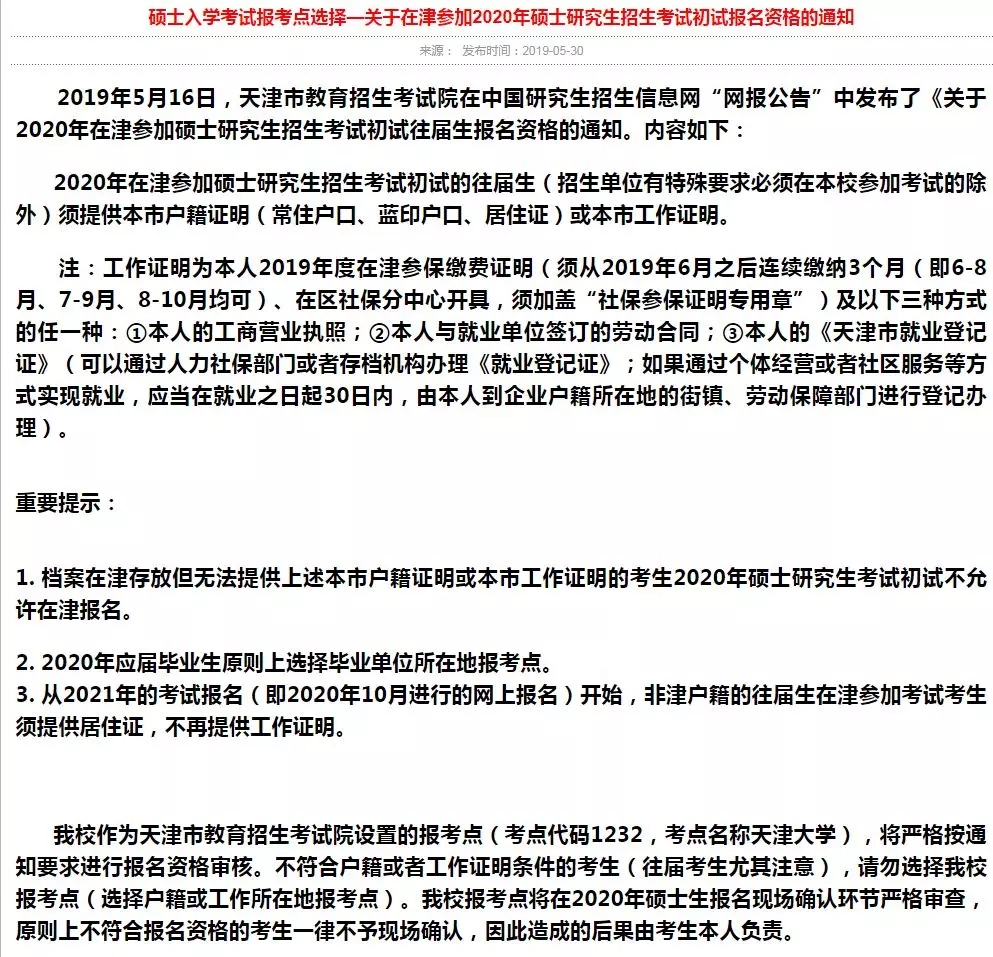 2020年在津參加碩士研究生招生考試初試的往屆生(招生單位有特殊要求必須在本校參加考試的除外)須提供本市戶籍證明(常住戶口、藍(lán)印戶口、居住證)或本市工作證明。