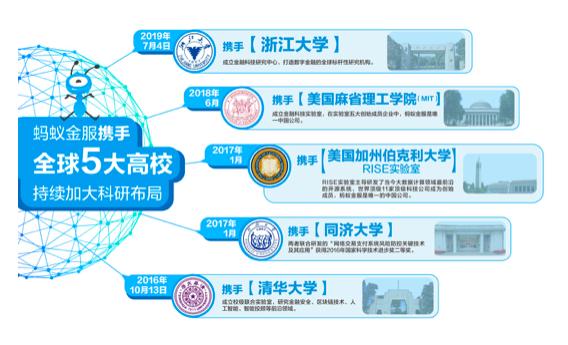 7月4日,螞蟻金服和浙江大學宣布戰略合作,雙方共同應對全球化和數字經濟時代面臨的新挑戰,為未來數字經濟時代的全球治理、技術創新、 商業模式、人才培養、可持續發展等提供方案,雙方將聯合成立浙江大學金融科技研究中心,打造成數字金融的全球標桿性研究機構。