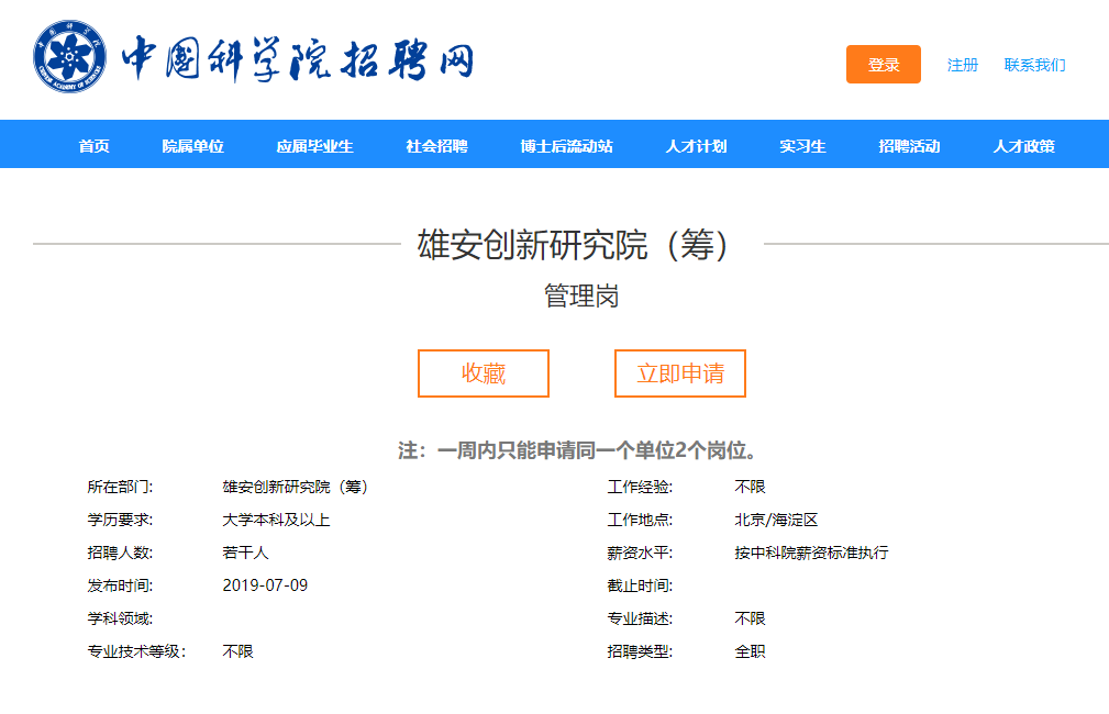 近日,中國科學院官方網站發布招聘啟事,因事業發展需要,中科院雄安創新研究院(籌)招聘管理人員若干,薪資按中科院薪資標準執行。