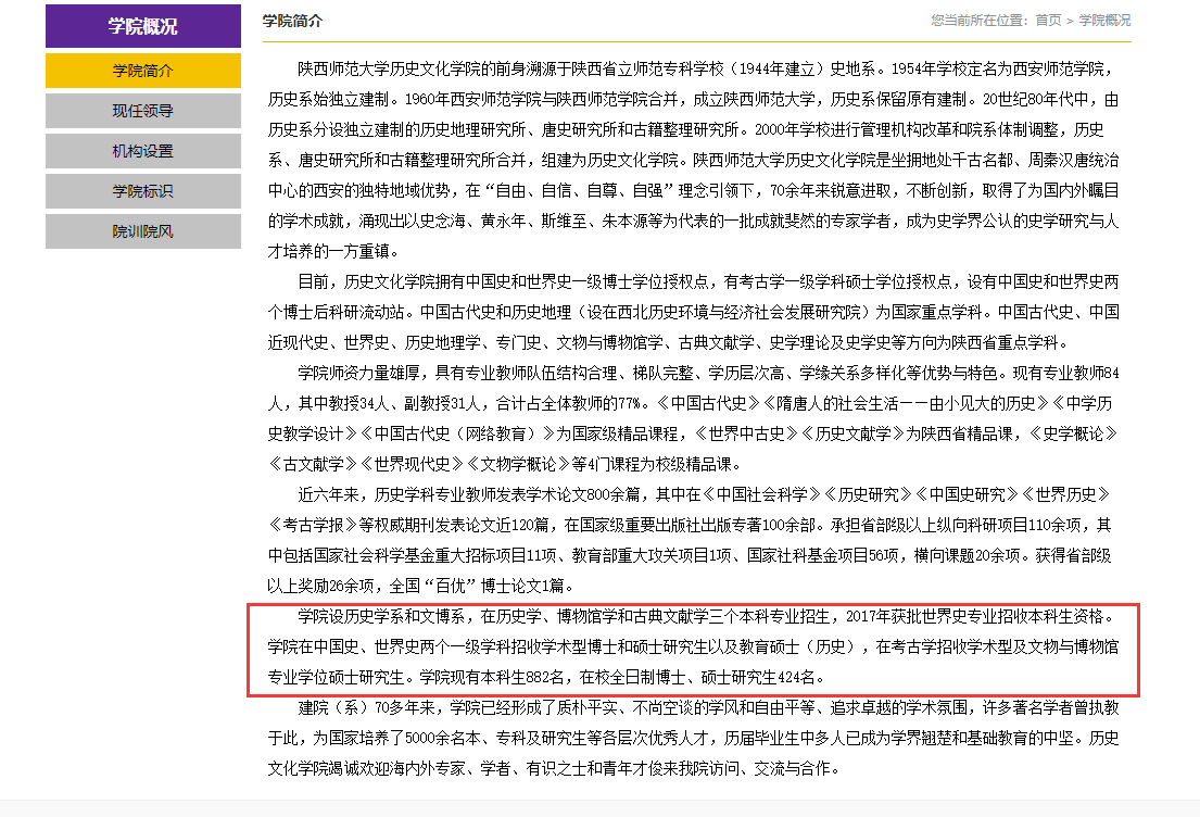 陜西師范大學(xué)歷史文化學(xué)院擁有中國史和世界史一級博士學(xué)位授權(quán)點,有考古學(xué)一級學(xué)科碩士學(xué)位授權(quán)點,設(shè)有中國史和世界史兩個博士后科研流動站。