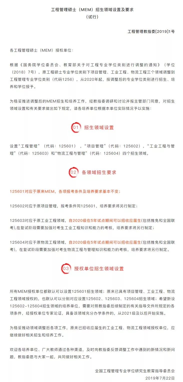 以上就是“《2019工程管理碩士(MEM)招生領域設置及要求》新鮮出爐,應屆生皆可報考!”的全部內容!更多考研新鮮資訊,盡在“考研動態”欄目!