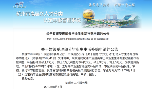 8月5日,杭州市人才服務局發布《關于暫緩受理部分畢業生生活補貼申請的公告》(下稱“《公告》”)。《公告》顯示,現實施的杭州市應屆高學歷畢業生生活補貼政策將作相應調整,補貼標準由碩士2萬元、博士3萬元調整為本科1萬元、碩士3萬元、博士5萬元。這意味著,不僅是應屆碩博士補貼金額提高,應屆本科生留杭也有補貼。