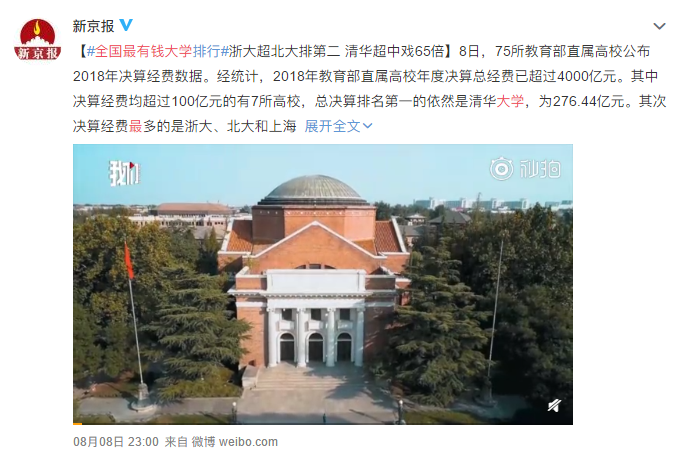 近期,75所教育部直屬高校公布2018年決算經(jīng)費(fèi)數(shù)據(jù)。經(jīng)統(tǒng)計,2018年教育部直屬高校年度決算總經(jīng)費(fèi)已超過4000億元。其中決算經(jīng)費(fèi)均超過100億元的有7所高校,總決算排名第一的依然是清華大學(xué),為276.44億元。其次決算經(jīng)費(fèi)最多的是浙大、北大和上海交大。