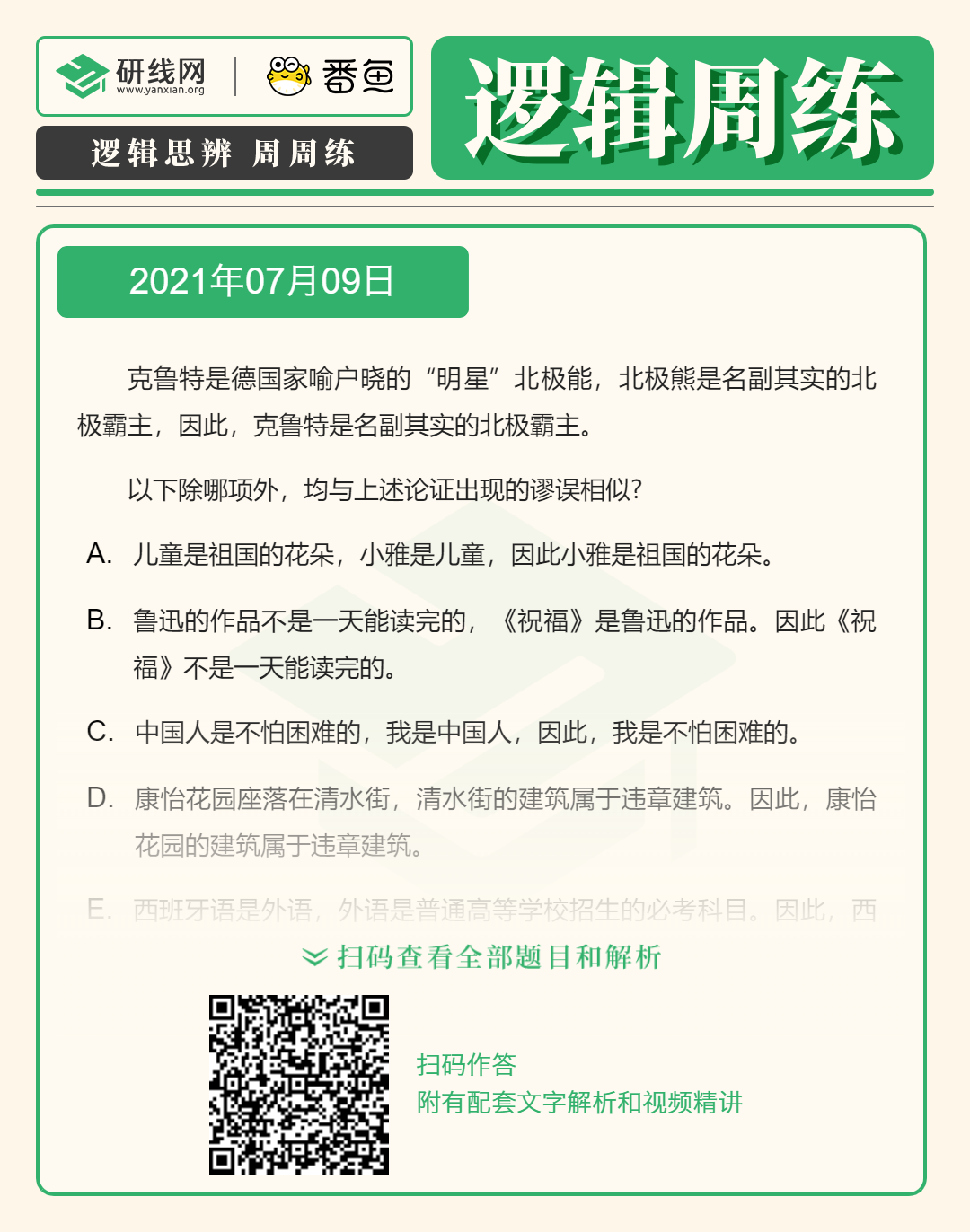以上就是小編為大家整理“2022考研邏輯備考:7月9日邏輯專項練習及答案”的全部內容,希望各位考生堅持利用起來,想要獲取更多內容請持續關注本網站。