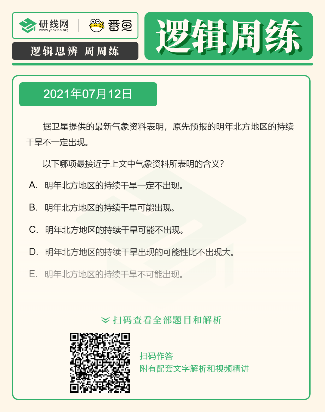 以上就是小編為大家整理“2022考研邏輯備考:7月12日邏輯專項練習(xí)及答案”的全部內(nèi)容,希望各位考生堅持利用起來,想要獲取更多內(nèi)容請持續(xù)關(guān)注本網(wǎng)站。