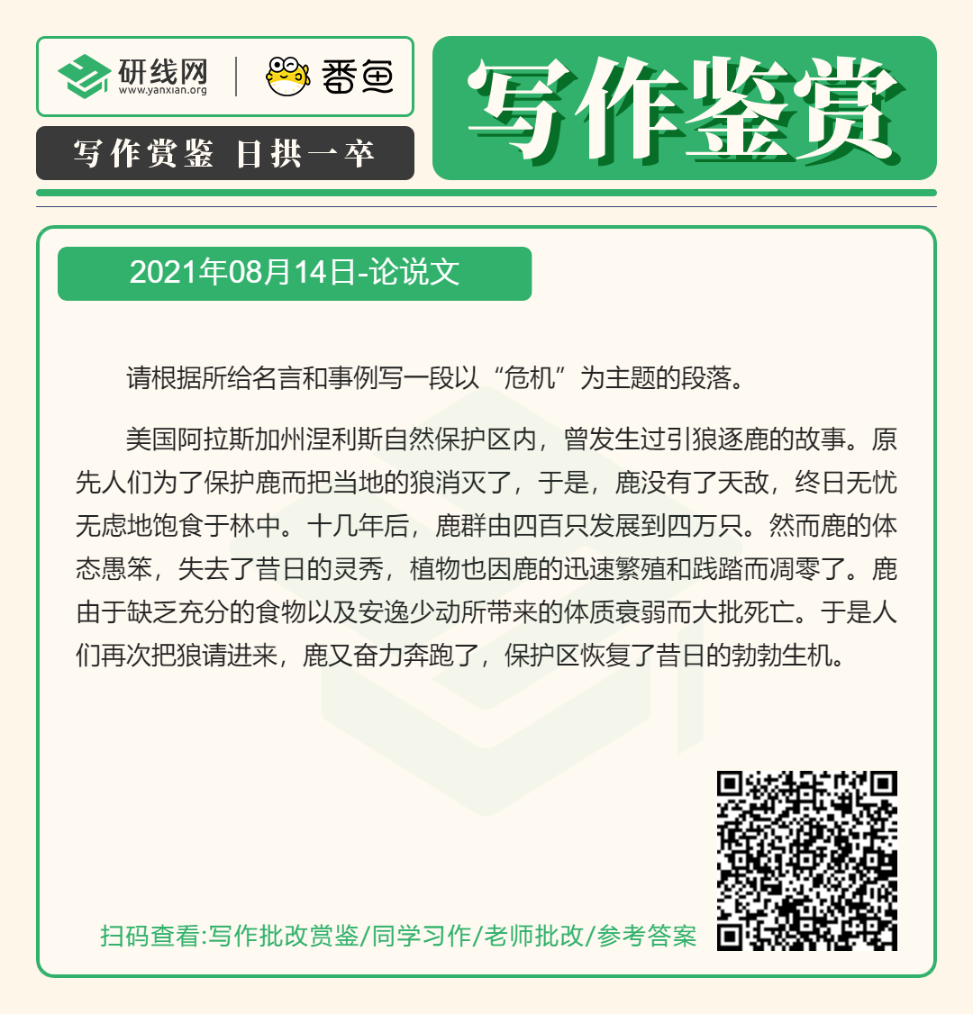 以上就是小編為大家整理“2022考研寫作備考:8月14日寫作鑒賞及答案”的全部內(nèi)容,希望各位考生堅持利用起來,想要獲取更多內(nèi)容請持續(xù)關(guān)注本網(wǎng)站。