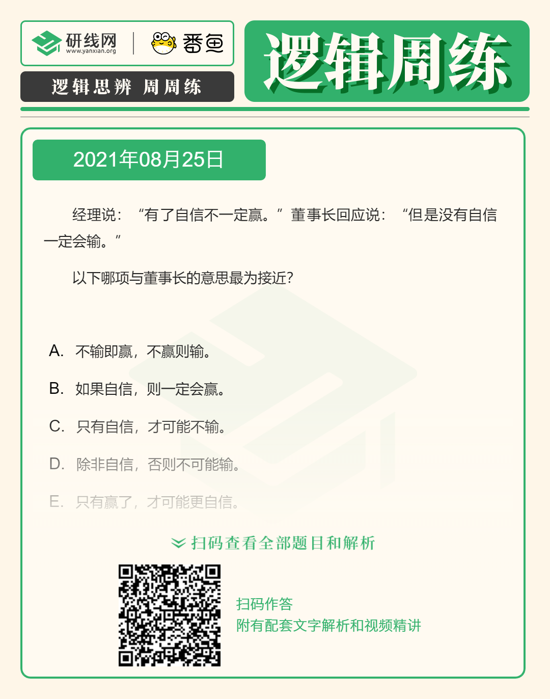 以上就是小編為大家整理“2022考研邏輯備考:8月25日邏輯專項練習及答案”的全部內容,希望各位考生堅持利用起來,想要獲取更多內容請持續關注本網站。