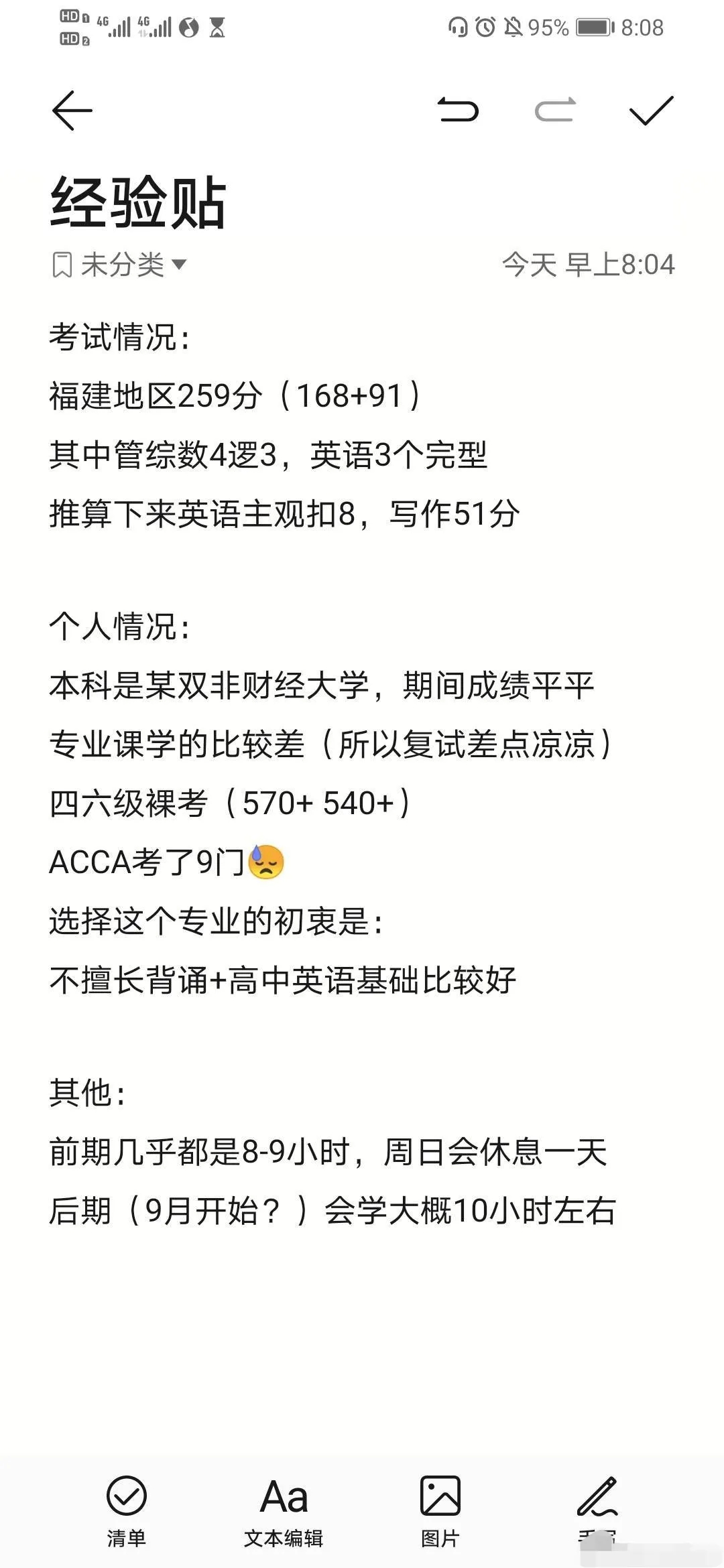 初試成績:在福建地區259分(168+91):管綜數4邏3,英語3個完型,推算下來英語主觀扣8,寫作51。