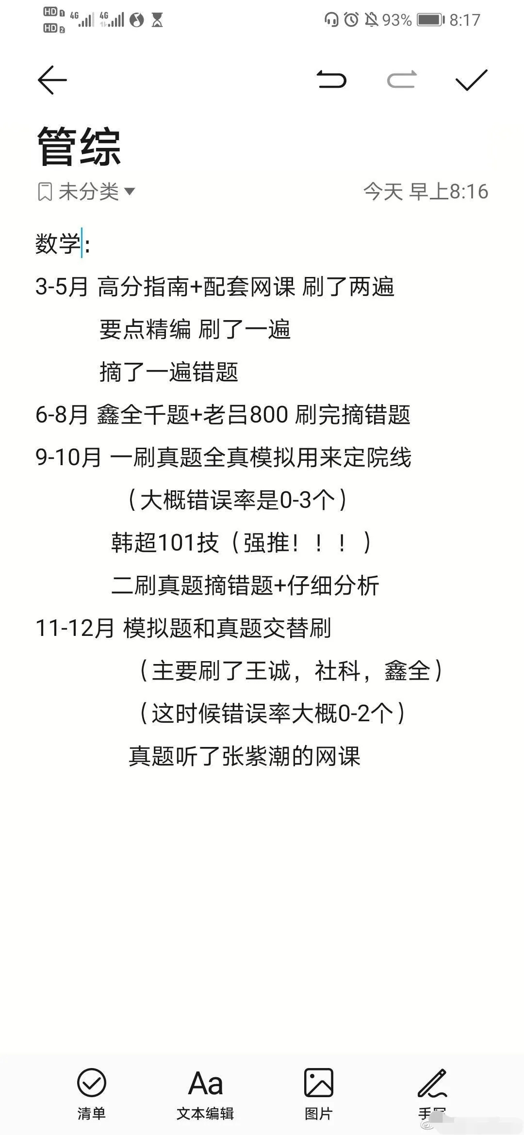 復習時長:前期8-9小時,周日休一天;后期(9月份?)每天學習10小時。