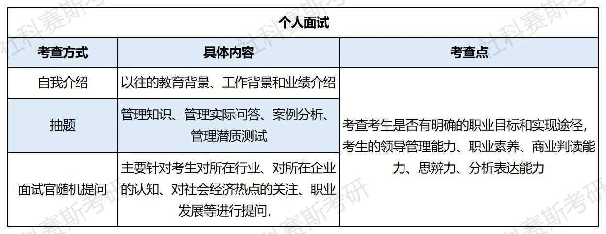 個人面試:一般會有3-5個面試官提問,面試官包括校內商學院教授以及外部企業的優秀校友,一般大約在10~30分鐘。多是考官與考生隨機互動。具體考查方式有以下三種: