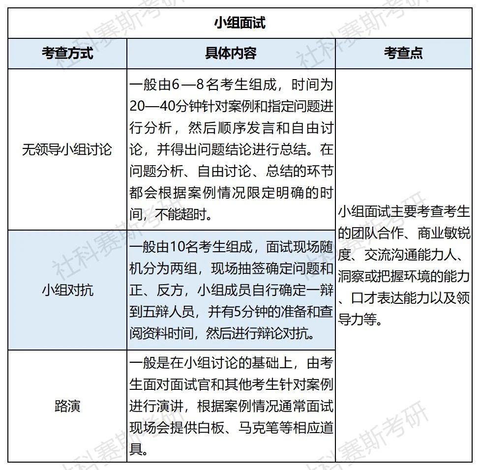 小組面試:一般是由多名考生組成小組,針對面試官指定的管理型或社會經濟案例進行討論,面試過程中,面試官不進行參與,而是在旁觀察考生的發言和表現,從而對考生的綜合能力做出評判。