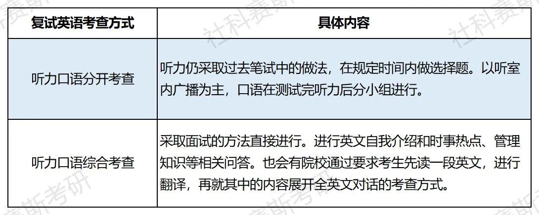 (2)英語:MBA復試中通常會有英語口語和聽力測試,以在綜合素質面試中通過要求考生進行英文自我介紹和時事熱點、管理知識等相關問答考查的方式居多,報考MBA國際班的考生要求會比較嚴格,雙一流名校國際班的英語水平平均可以達到雅思6.0及以上。具體考查方式有以下兩種: