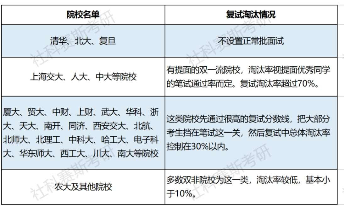 具體情況這里我們按照各院校對各因素的要求,將全國各大院校的復試淘汰情況進行了一定的統計,如下: